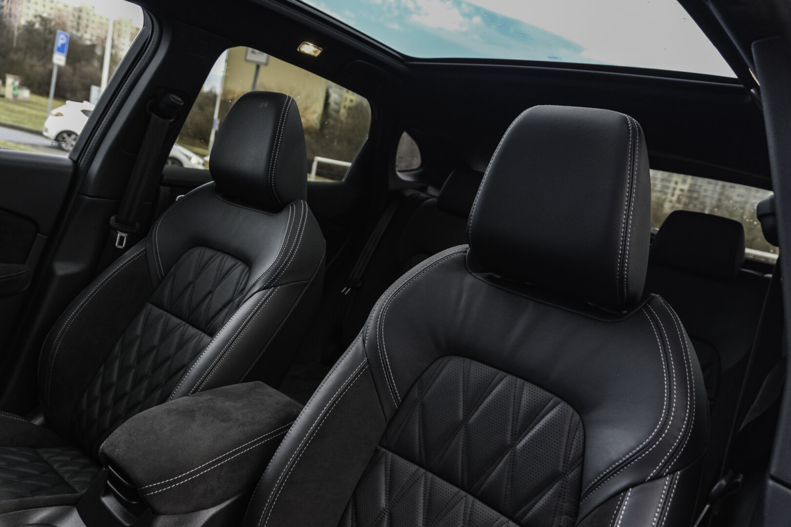 - Čalounění: Prémiové čalounění z prošívané kůže / Obložení interiéru: Alcantara